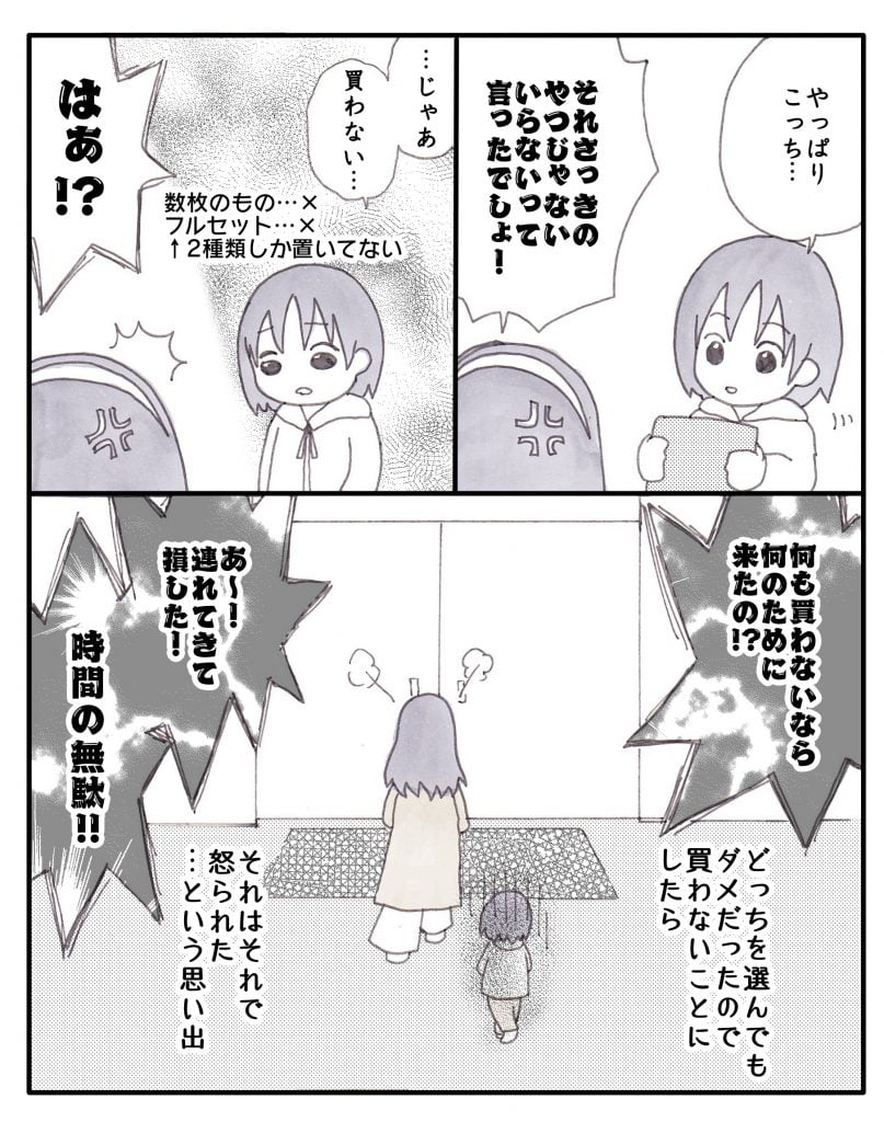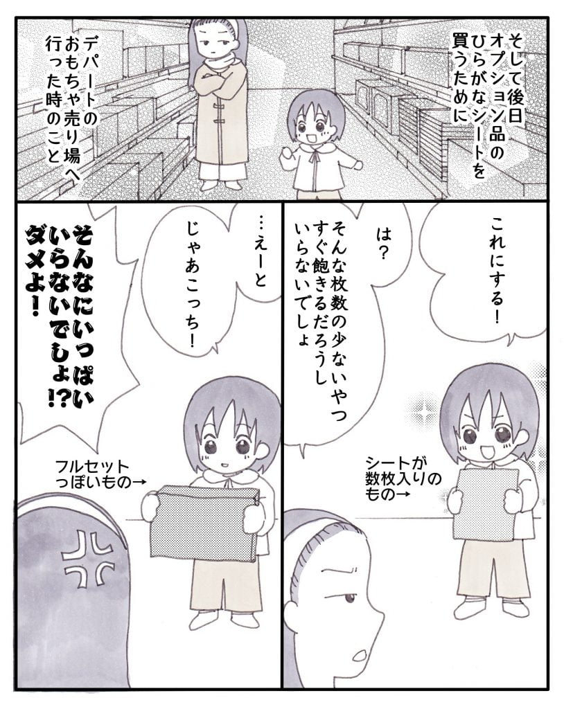 その後オプション品のなぞって書けるシートを買う為に母とデパートへ行ったのですが、数枚入りのものと、フルセットぽいものの2種類しか置いておらず、どちらを選んでもダメだと母が怒るので、諦めて買わないと伝えるとそれはそれで怒らせてしまいました。