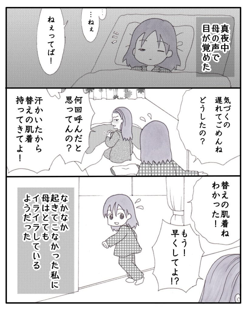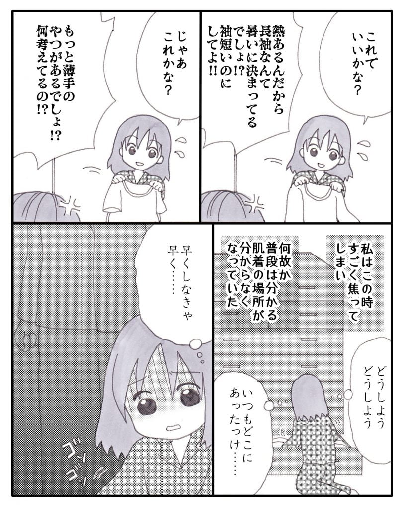 替えの肌着を何度母の元に持って行っても違うと言われ、いつもなら分かるはずの収納場所が、この時だけは焦りのせいか全く分からず、冷や汗をかきながらタンスをあさっていました。