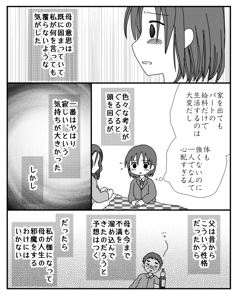 ただ、母は昔から心臓が弱いと言っていたし、よく体調を崩す人だったので、パートをしているとはいえ、一人ではとても生活が成り立たないのではと思い、学校を辞める覚悟で一緒について行くことを提案しましたが却下。