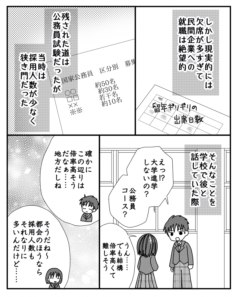 ただ就職コースにしたとしても、欠席が留年ギリギリという状態なので民間企業は絶望的。