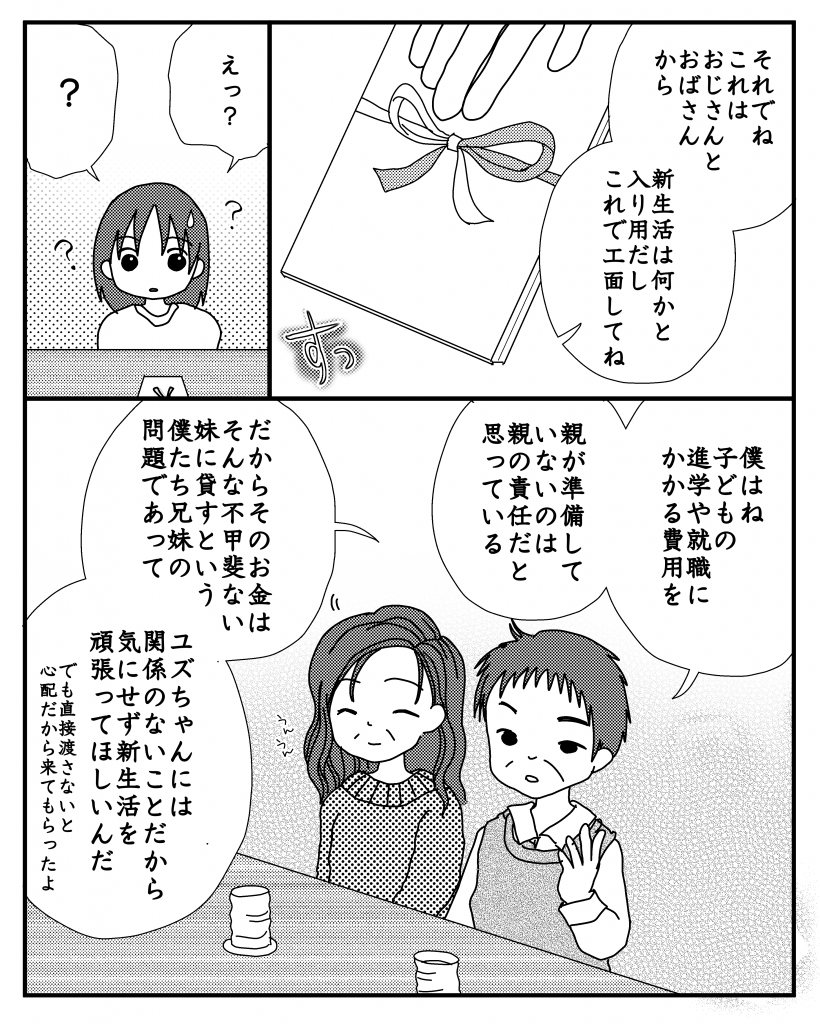 そんな時、伯父夫婦の家に付いてくるよう言われ、そこで伯父から就職祝いだとお金を渡されました。