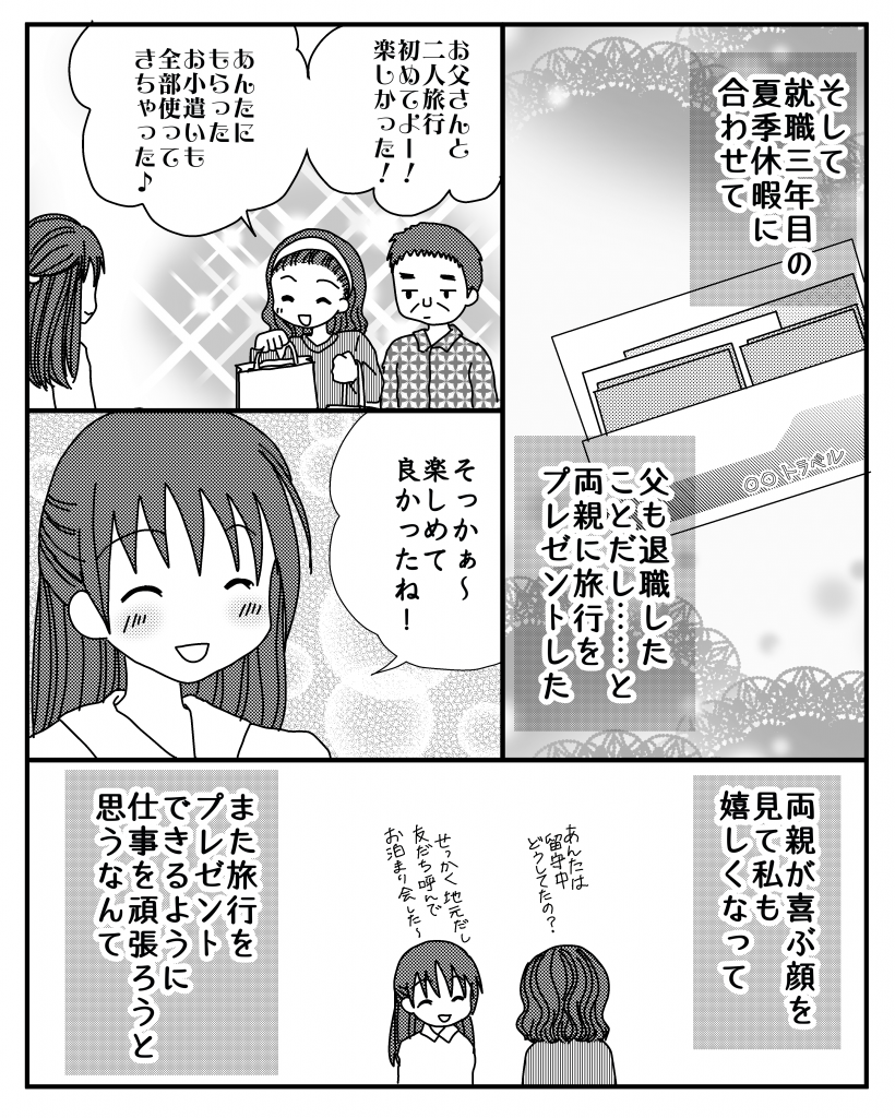 それでも両親に旅行をプレゼントをして喜んでもらいたいという一心で、少ない生活費から旅行費用の貯蓄を続けていたのは、共依存関係が続いていて、『親の為にお金を貯めている自分』というものが生きがいだったからだと思います。